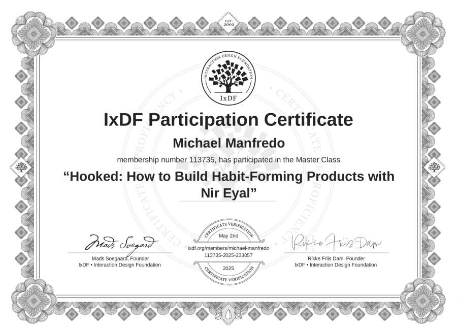 Michael Manfredo's IxDF Masterclass Certificate: Hooked: How to Build Habit-Forming Products with Nir Eyal