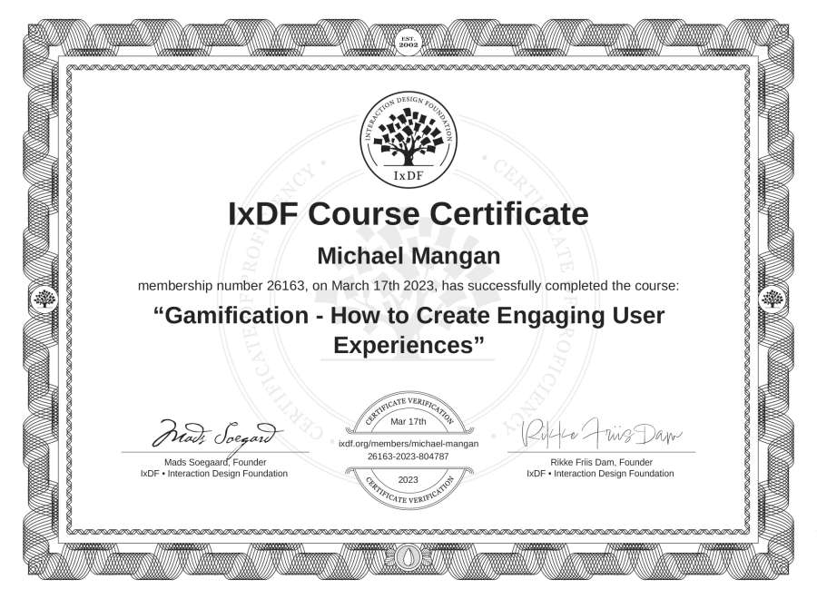 Michael Mangan's IxDF Course Certificate: Gamification - How to Create Engaging User Experiences