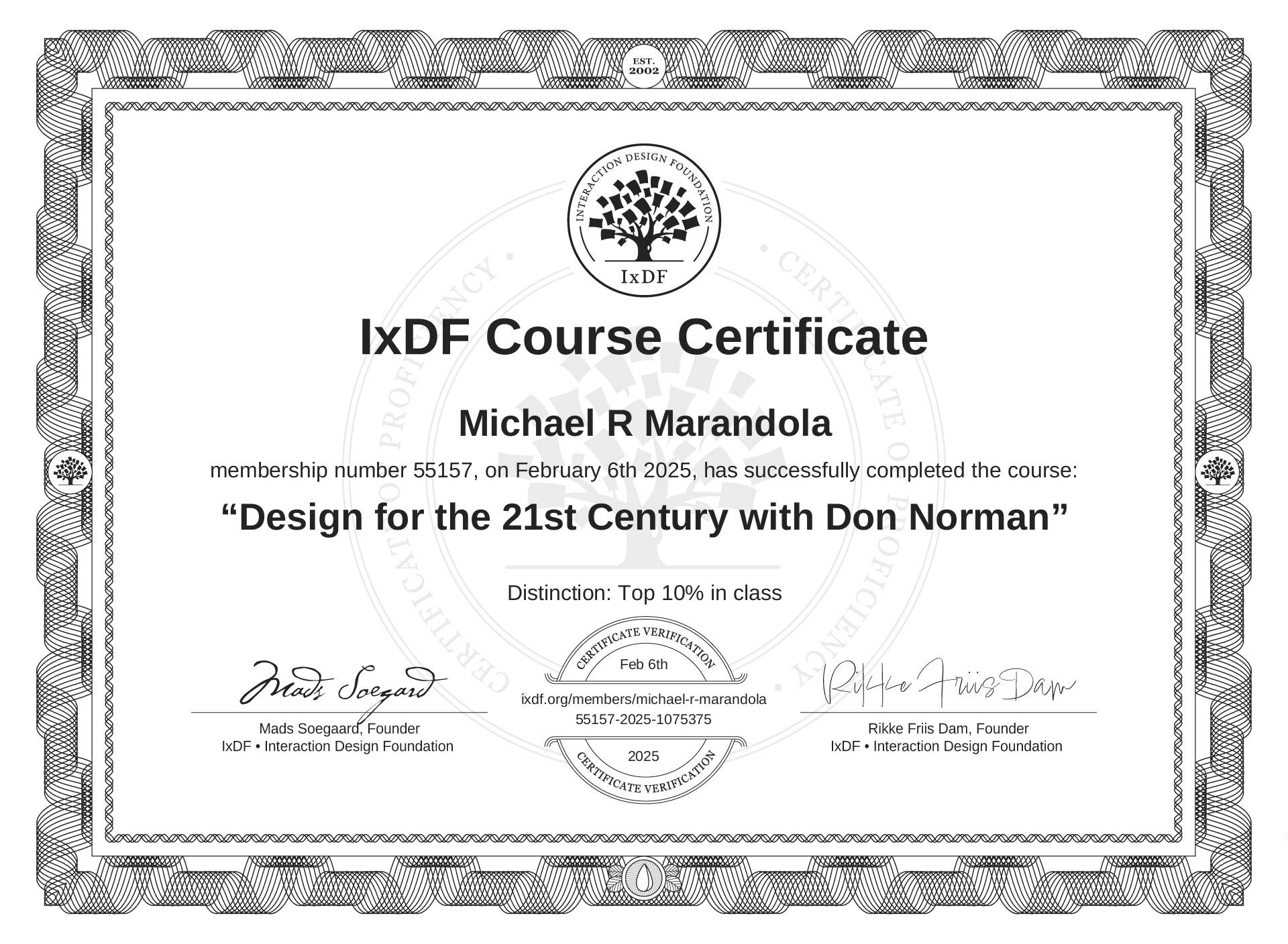 The IxDF Course Certificate above is awarded to Michael R Marandola with a Top 10% Distinction in formal recognition of their coursework surpassing the rigorous benchmarks of exceptional performance established by the IxDF Educational Codex.