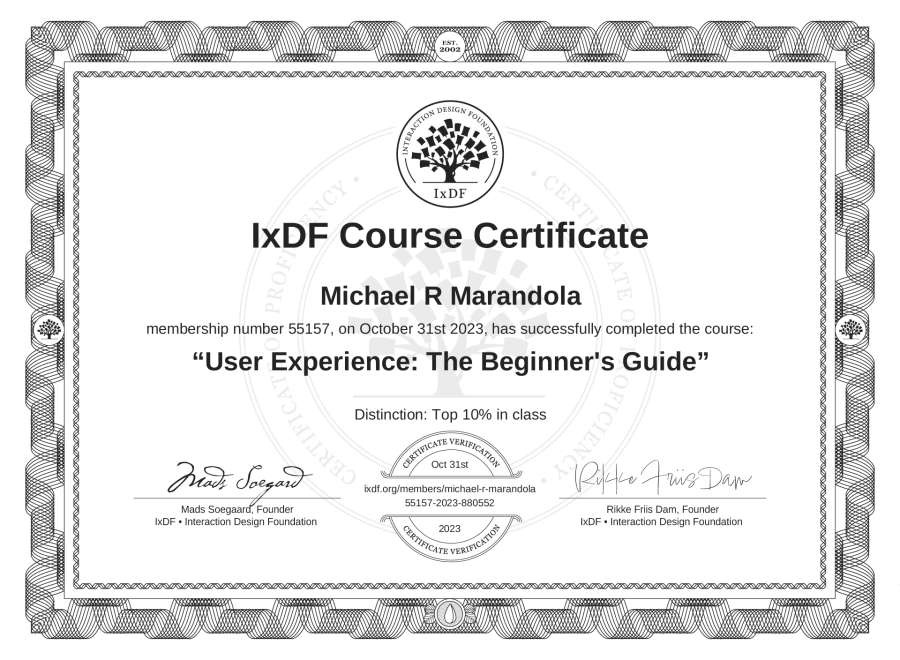 The IxDF Course Certificate above is awarded to Michael R Marandola with a Top 10% Distinction in formal recognition of their coursework surpassing the rigorous benchmarks of exceptional performance established by the IxDF Educational Codex.