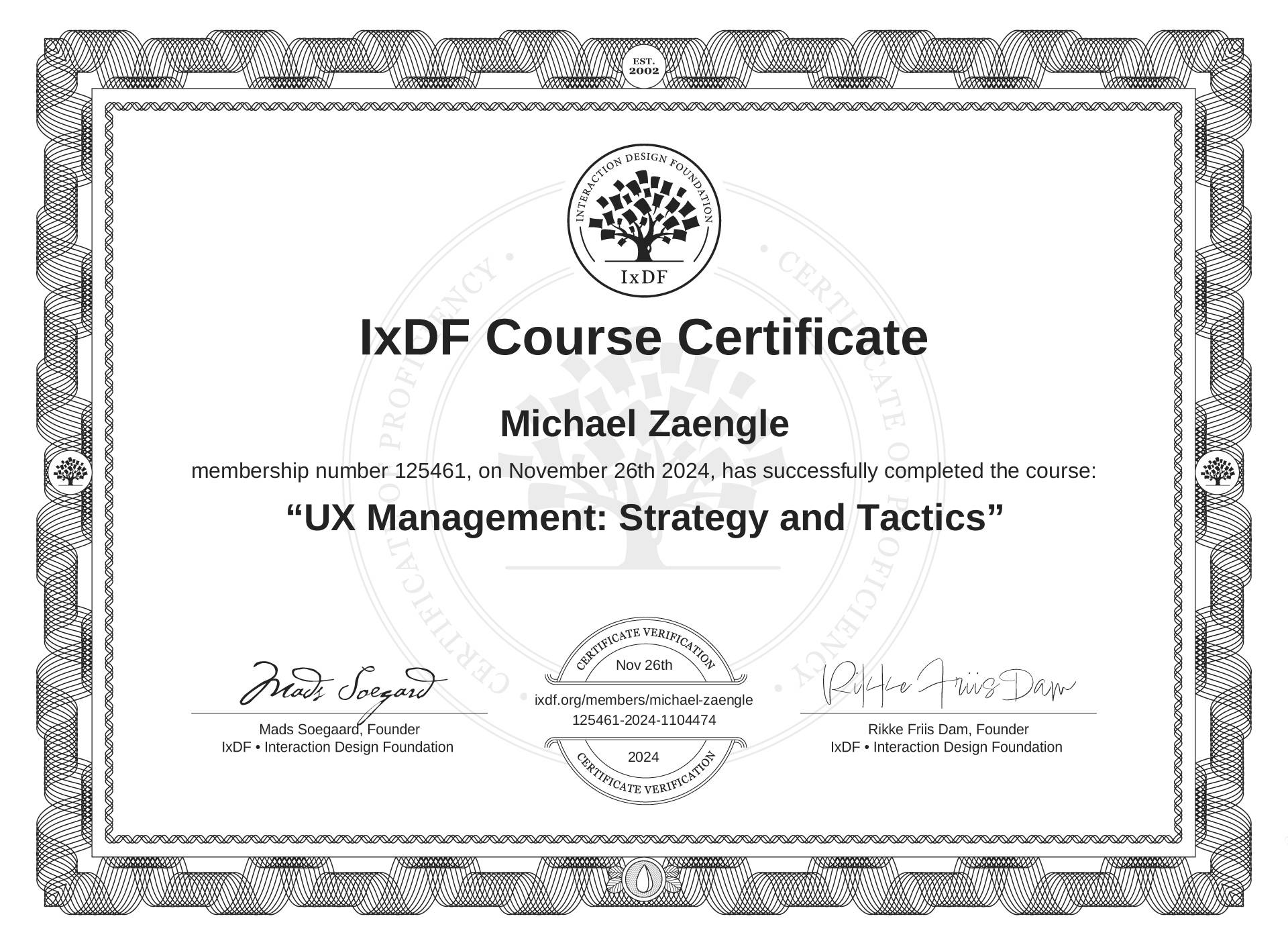 Michael Zaengle's IxDF Course Certificate: UX Management: Strategy and Tactics