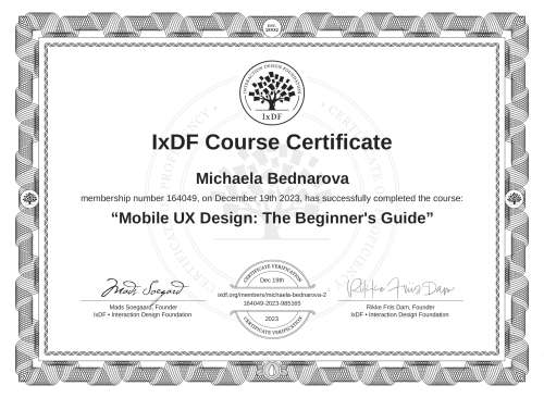 IxDF Course Certificates are awarded to Michaela Bednarova in formal recognition of their coursework surpassing the rigorous benchmarks of exceptional performance established by the IxDF Educational Codex.