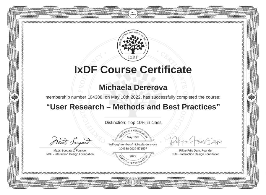 Michaela Dererova's IxDF Course Certificate: User Research – Methods and Best Practices
