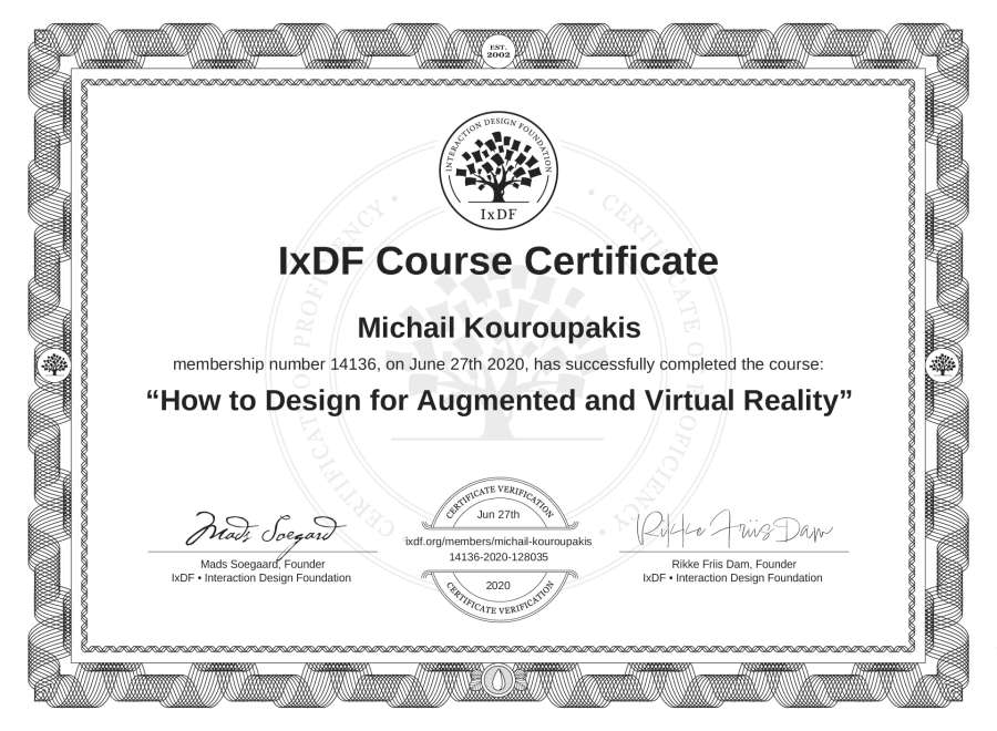 Michail Kouroupakis's IxDF Course Certificate: How to Design for Augmented and Virtual Reality
