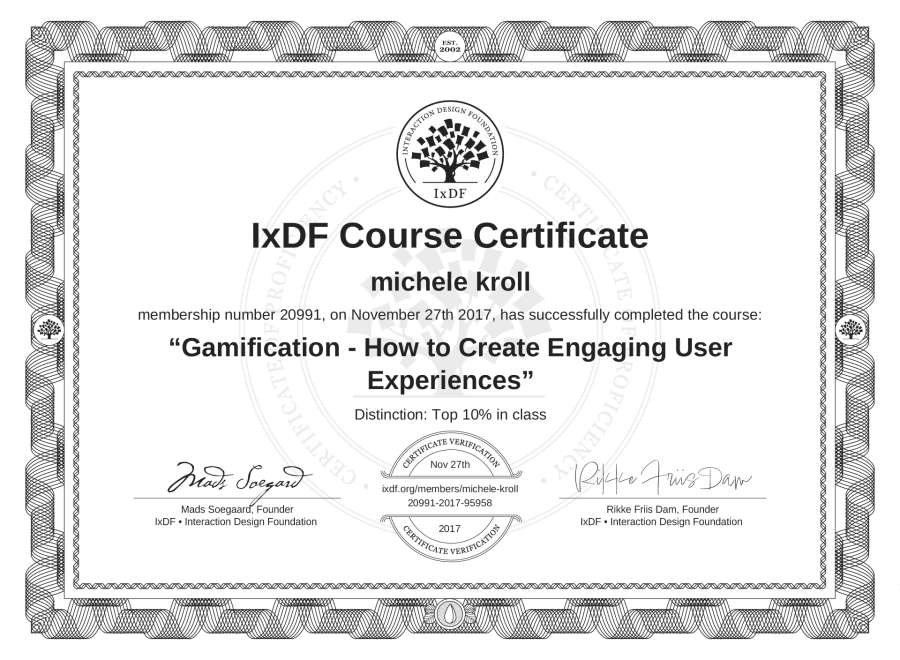 michele kroll's IxDF Course Certificate: Gamification - How to Create Engaging User Experiences
