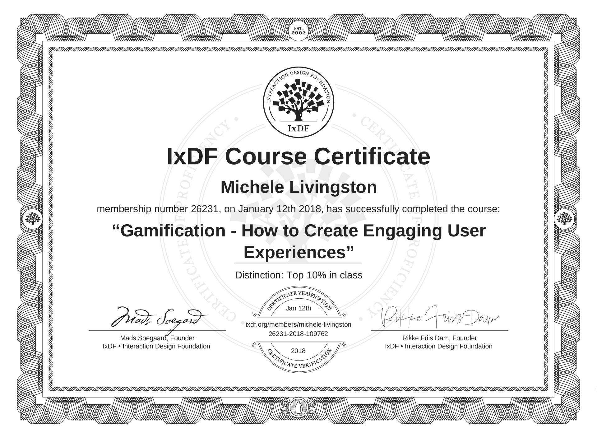 Michele Livingston's IxDF Course Certificate: Gamification - How to Create Engaging User Experiences