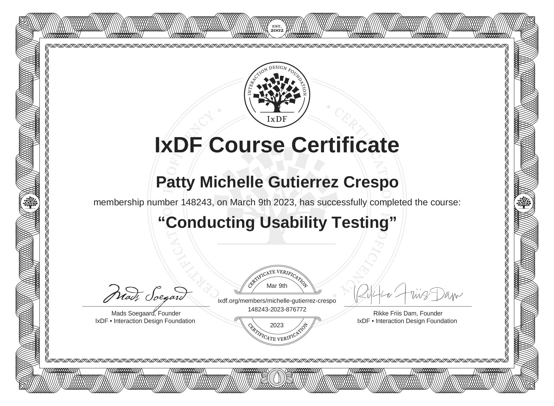 The IxDF Course Certificate above is awarded to Patty Michelle Gutierrez Crespo in formal recognition of their coursework surpassing the rigorous benchmarks of exceptional performance established by the IxDF Educational Codex.