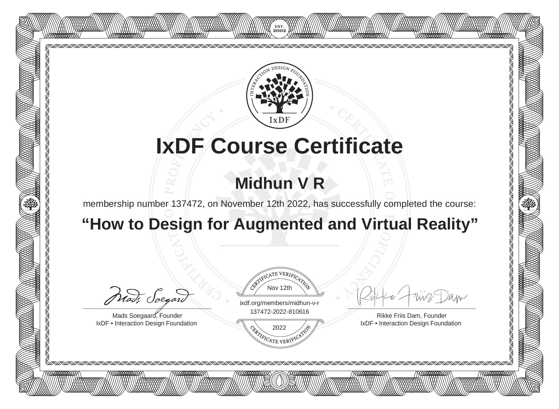 Midhun V R's IxDF Course Certificate: How to Design for Augmented and Virtual Reality