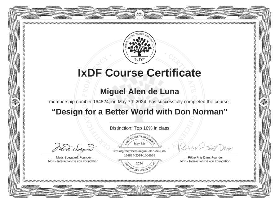 Miguel Alén de Luna's IxDF Course Certificate: Design for a Better World with Don Norman