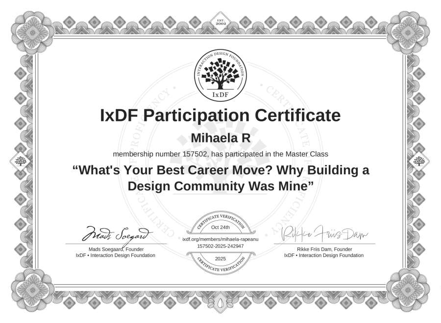 Mihaela R's IxDF Masterclass Certificate: What's Your Best Career Move? Why Building a Design Community Was Mine