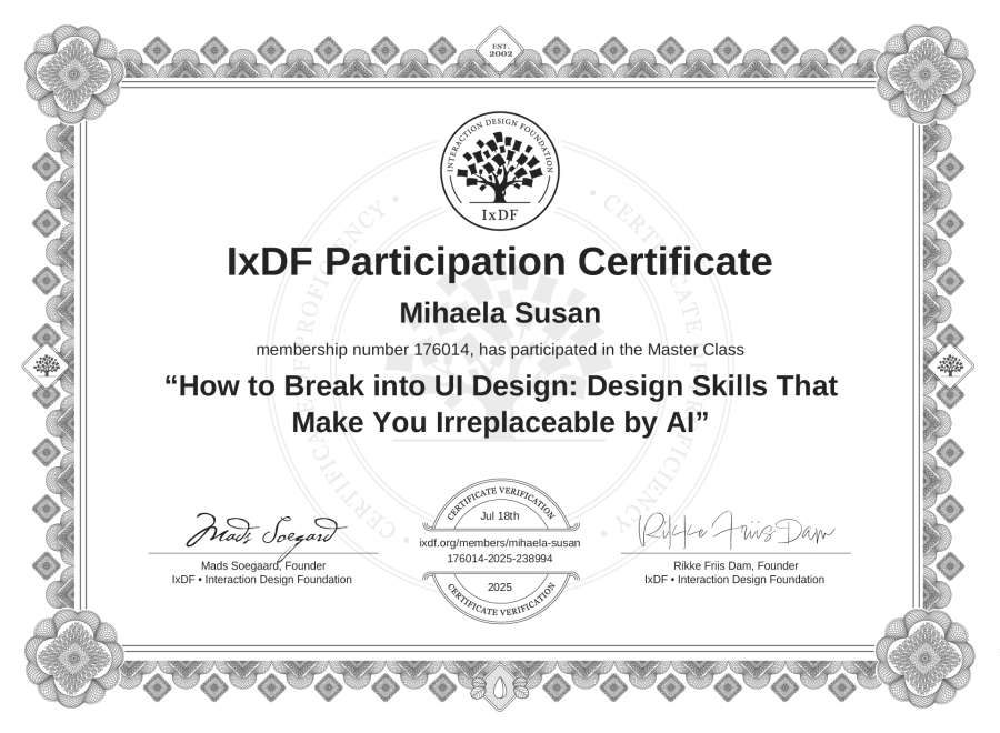 Mihaela Susan's IxDF Masterclass Certificate: How to Break into UI Design: Design Skills That Make You Irreplaceable by AI