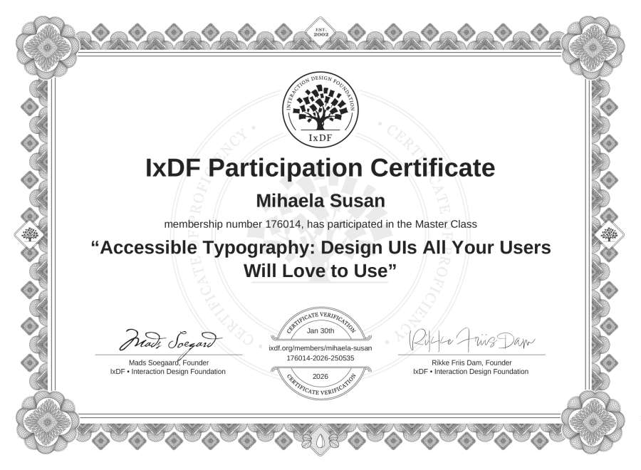 Mihaela Susan's IxDF Masterclass Certificate: Accessible Typography: Design UIs All Your Users Will Love to Use