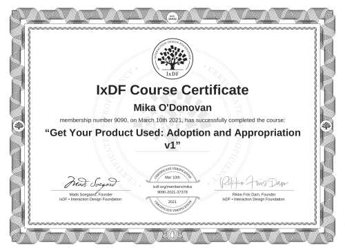 IxDF Course Certificates are awarded to Mika O'Donovan in formal recognition of their coursework surpassing the rigorous benchmarks of exceptional performance established by the IxDF Educational Codex.
