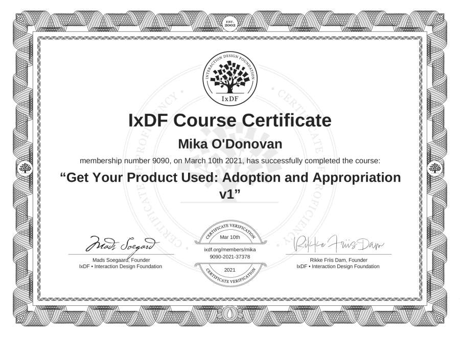 Mika O'Donovan's IxDF Course Certificate: Get Your Product Used: Adoption and Appropriation v1