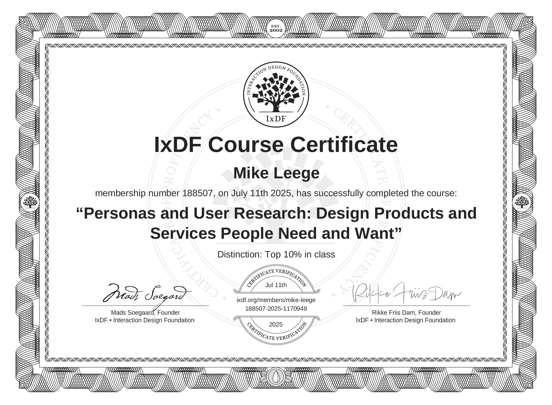 Mike Leege's IxDF Course Certificate: Personas and User Research: Design Products and Services People Need and Want