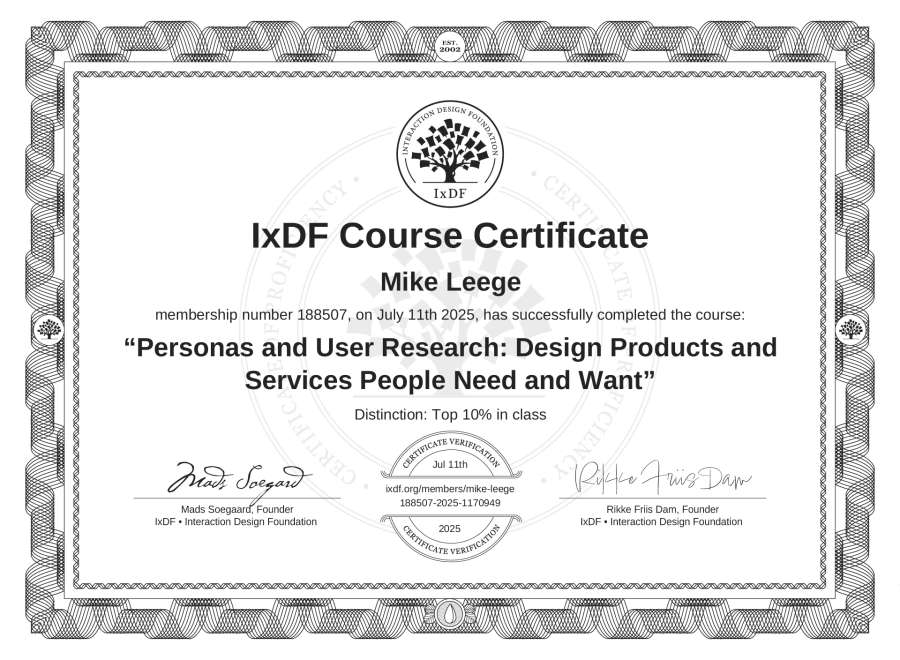The IxDF Course Certificate above is awarded to Mike Leege with a Top 10% Distinction in formal recognition of their coursework surpassing the rigorous benchmarks of exceptional performance established by the IxDF Educational Codex.