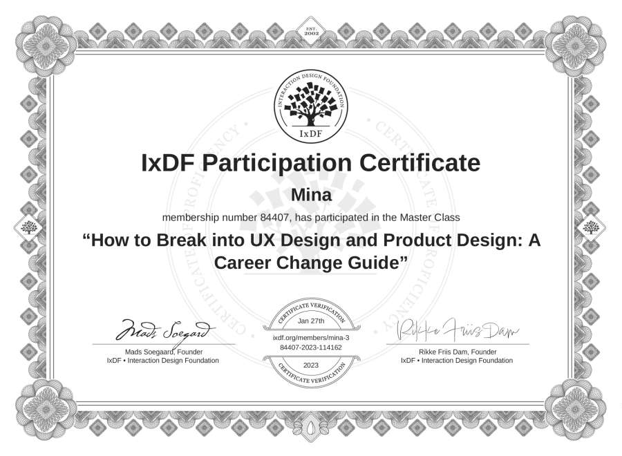 Mina's IxDF Masterclass Certificate: How to Break into UX Design and Product Design: A Career Change Guide