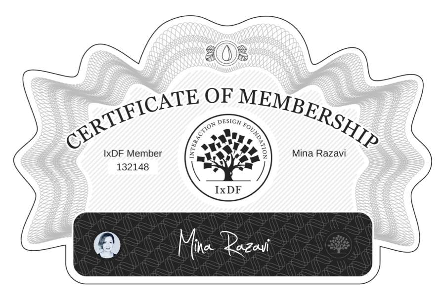 The Membership Certificate below verifies that Mina Razavi is a member of Interaction Design Foundation.