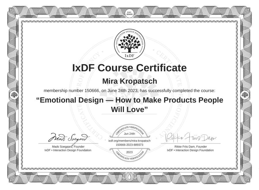 Mira Kropatsch's IxDF Course Certificate: Emotional Design — How to Make Products People Will Love
