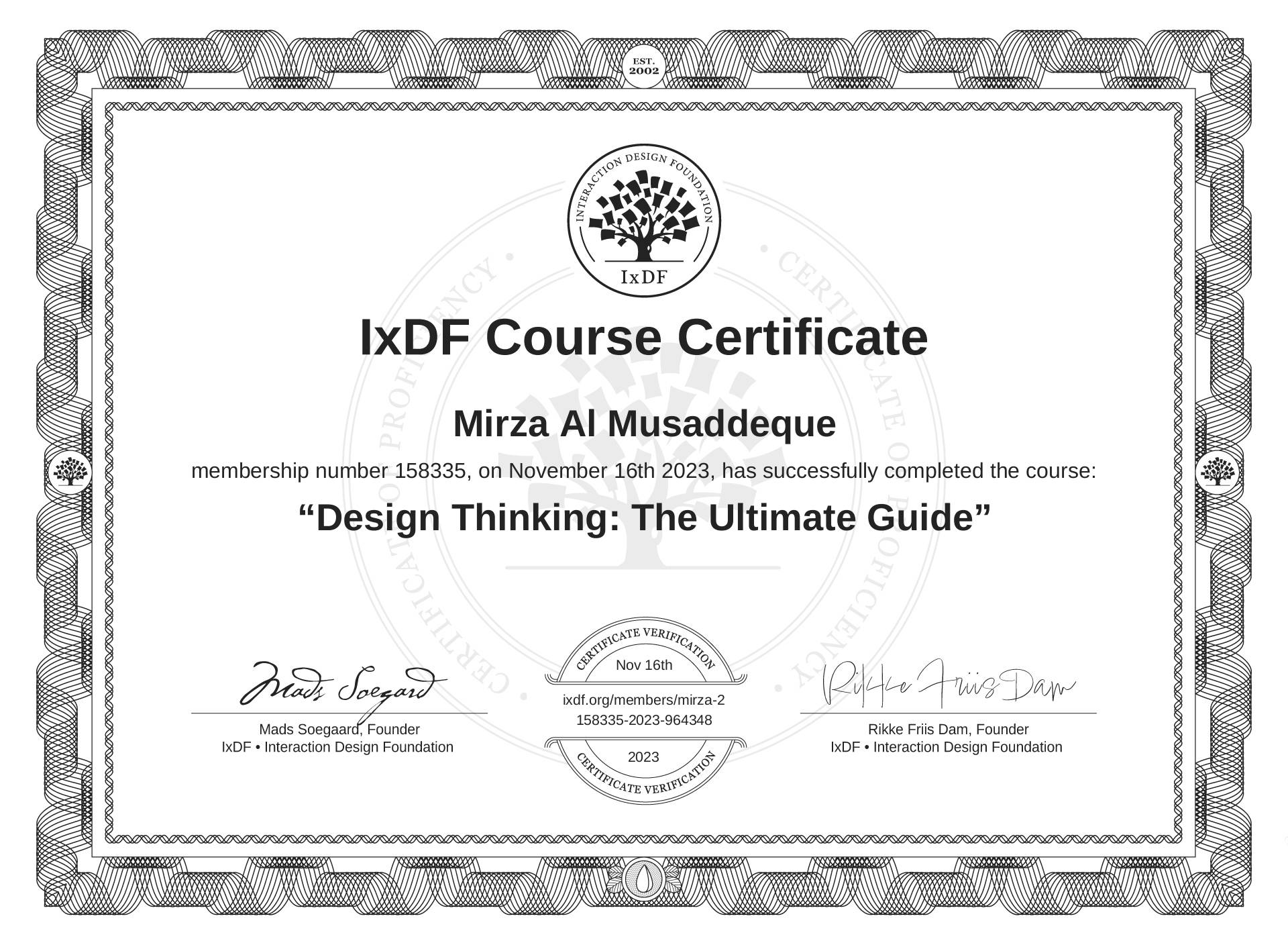 The IxDF Course Certificate above is awarded to Mirza Al Musaddeque in formal recognition of their coursework surpassing the rigorous benchmarks of exceptional performance established by the IxDF Educational Codex.