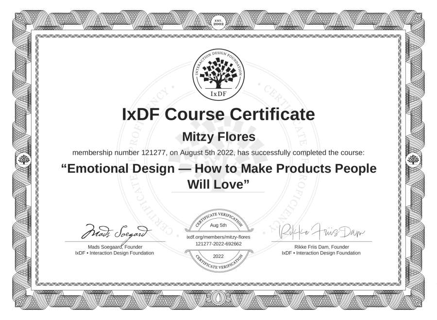 Mitzy Flores's IxDF Course Certificate: Emotional Design — How to Make Products People Will Love