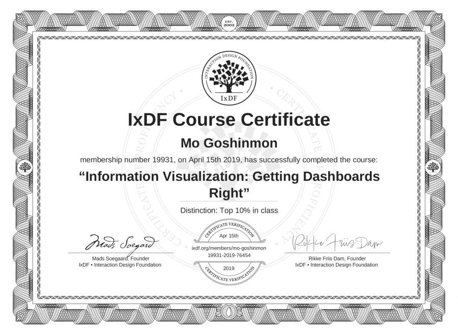 Mo Goshinmon's IxDF Course Certificate: Information Visualization: Getting Dashboards Right