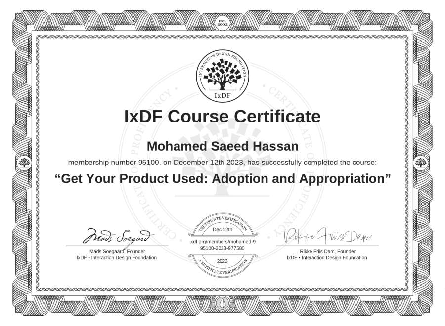 Mohamed Saeed Hassan's IxDF Course Certificate: Get Your Product Used: Adoption and Appropriation