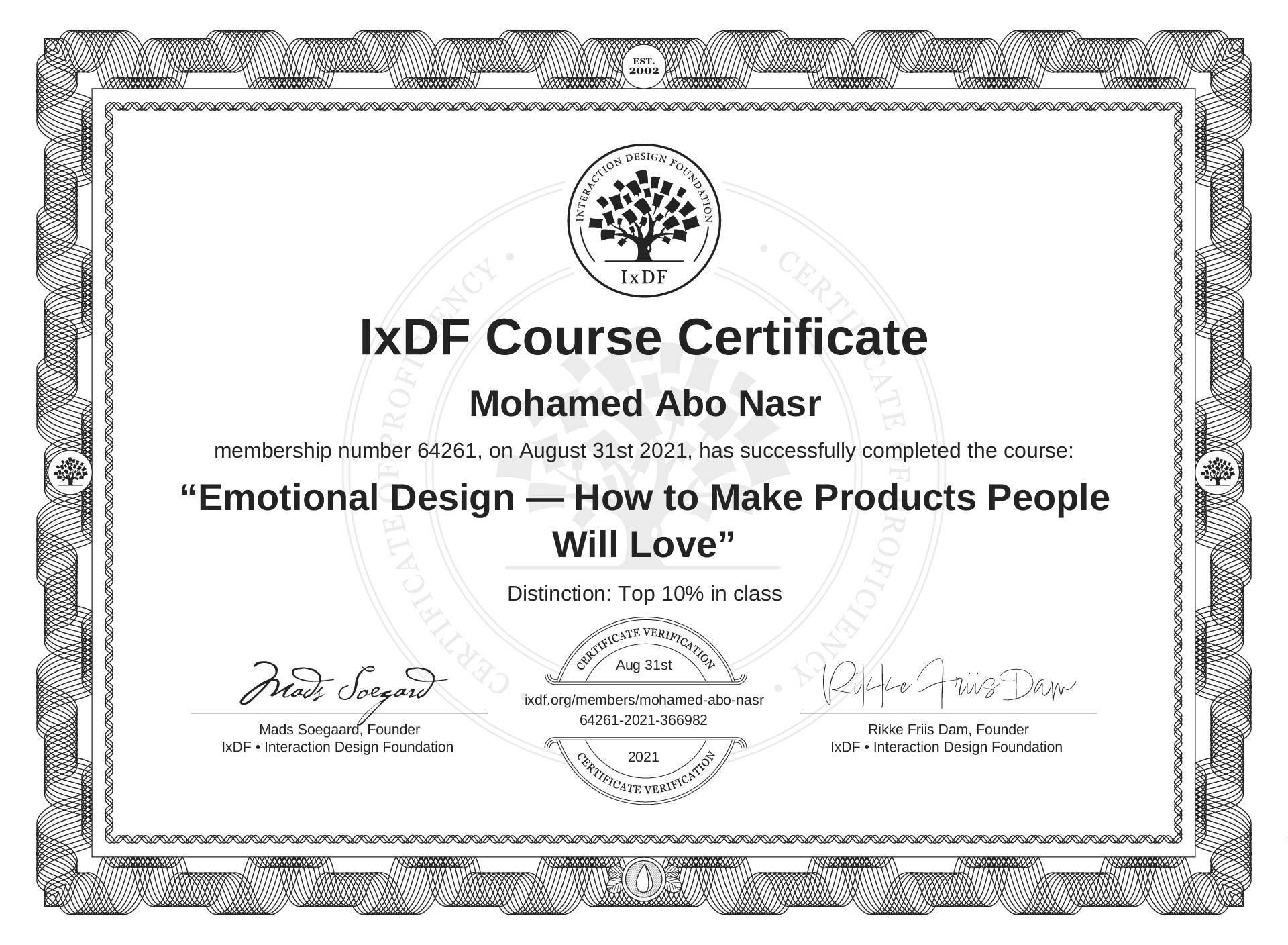 Mohamed Abo Nasr's IxDF Course Certificate: Emotional Design — How to Make Products People Will Love