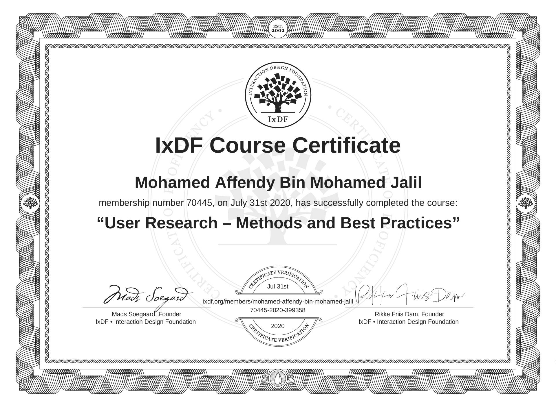 Mohamed Affendy Bin Mohamed Jalil's IxDF Course Certificate: User Research – Methods and Best Practices