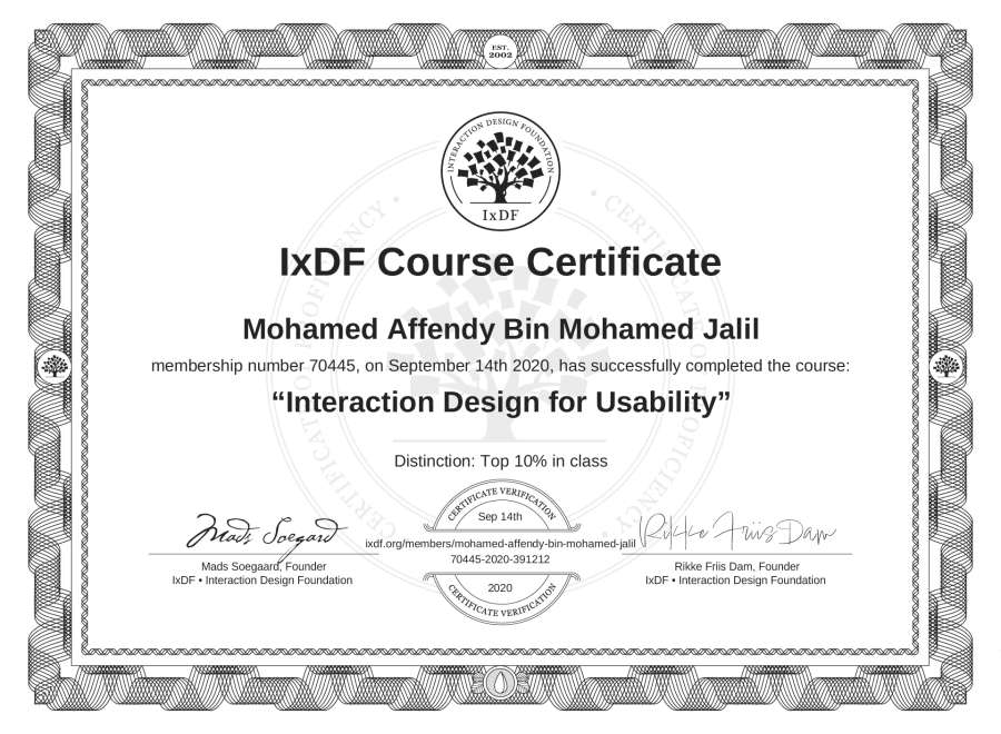 Mohamed Affendy Bin Mohamed Jalil's IxDF Course Certificate: Interaction Design for Usability