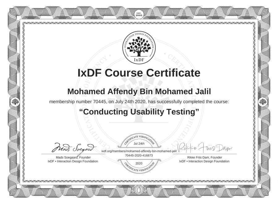 Mohamed Affendy Bin Mohamed Jalil's IxDF Course Certificate: Conducting Usability Testing