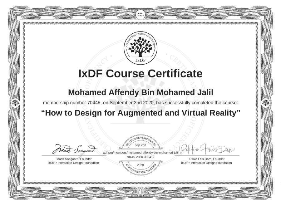 Mohamed Affendy Bin Mohamed Jalil's IxDF Course Certificate: How to Design for Augmented and Virtual Reality