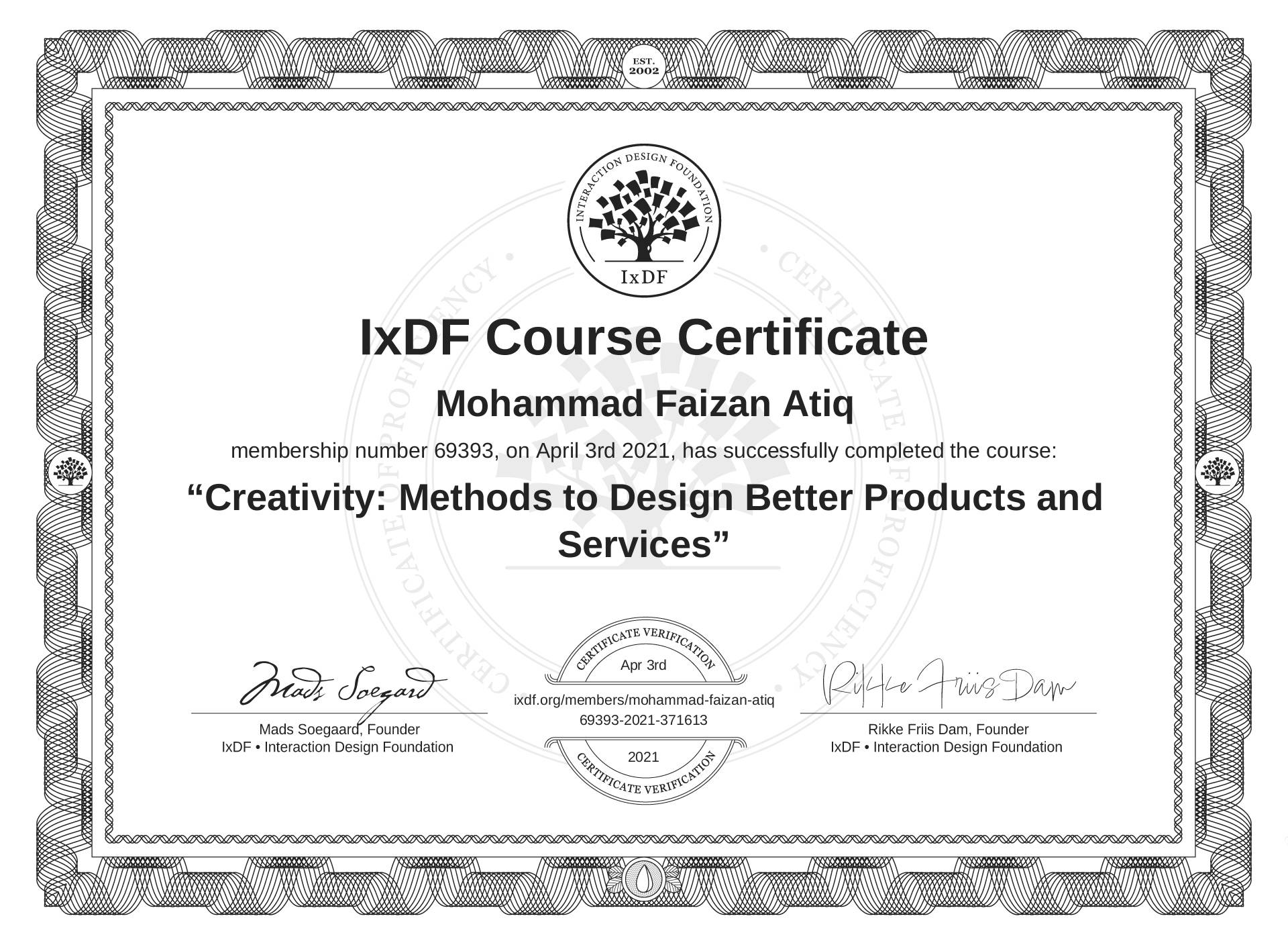 Mohammad Faizan Atiq's IxDF Course Certificate: Creativity: Methods to Design Better Products and Services