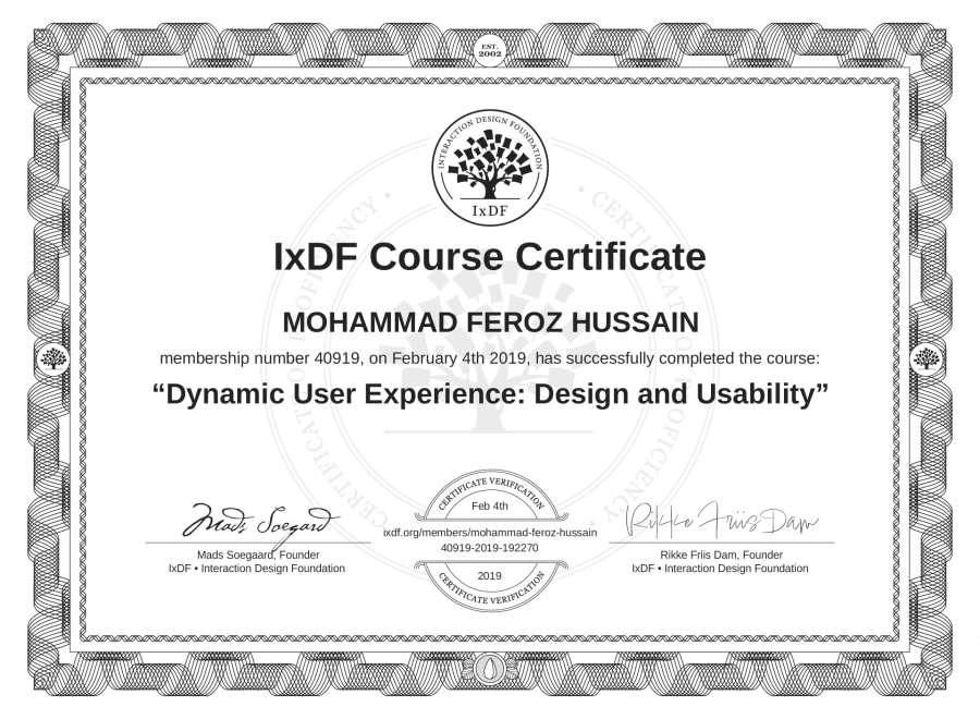 MOHAMMAD FEROZ HUSSAIN's IxDF Course Certificate: Dynamic User Experience: Design and Usability