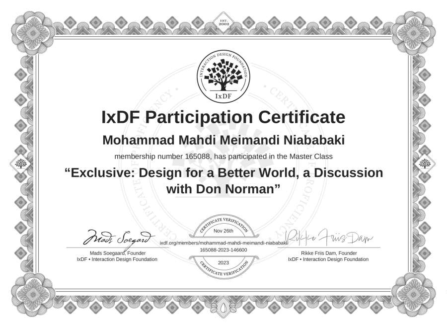 Mohammad Mahdi Meimandi Niababaki's IxDF Masterclass Certificate: Exclusive: Design for a Better World, a Discussion with Don Norman