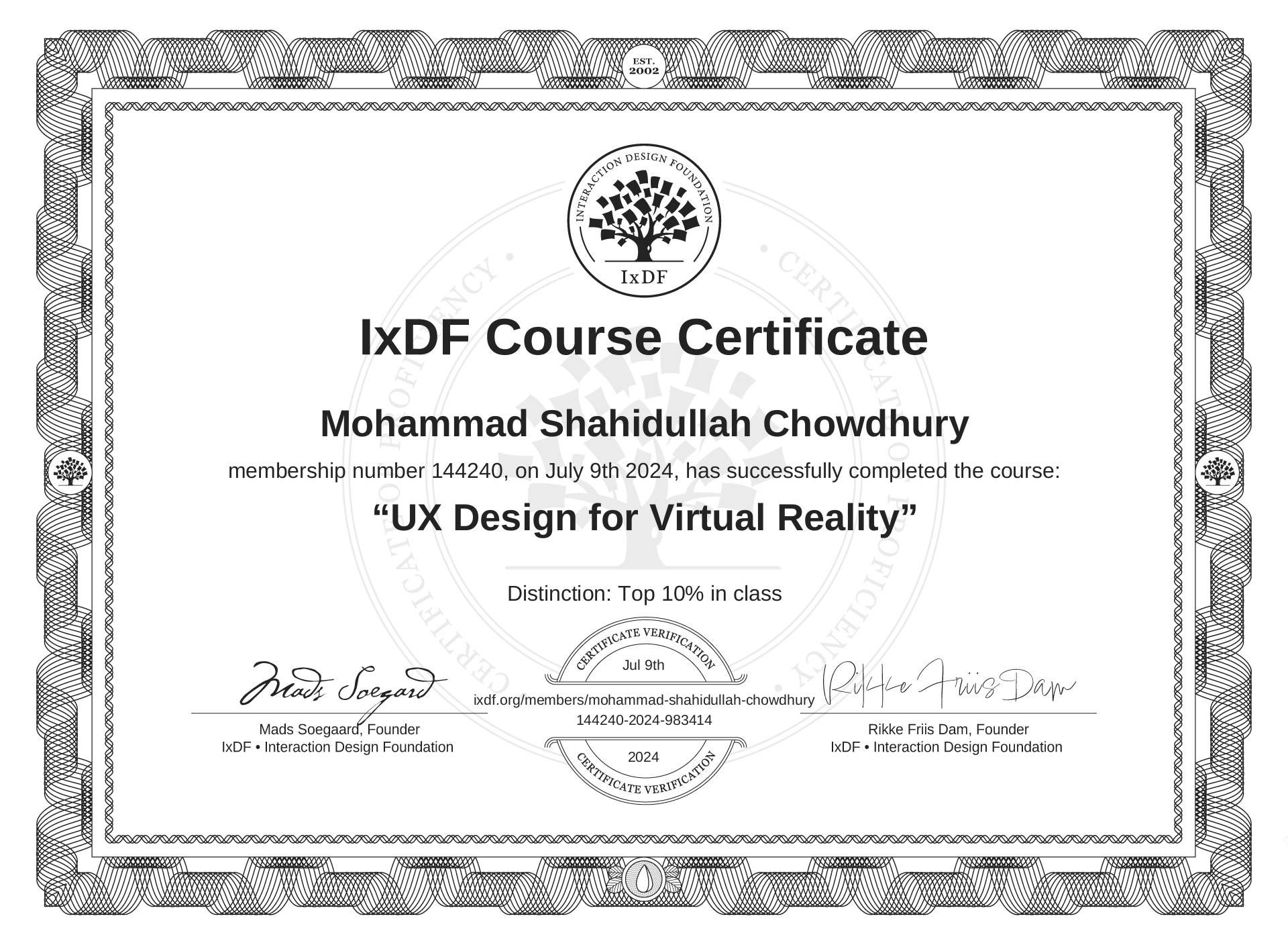Mohammad Shahidullah Chowdhury's IxDF Course Certificate: UX Design for Virtual Reality