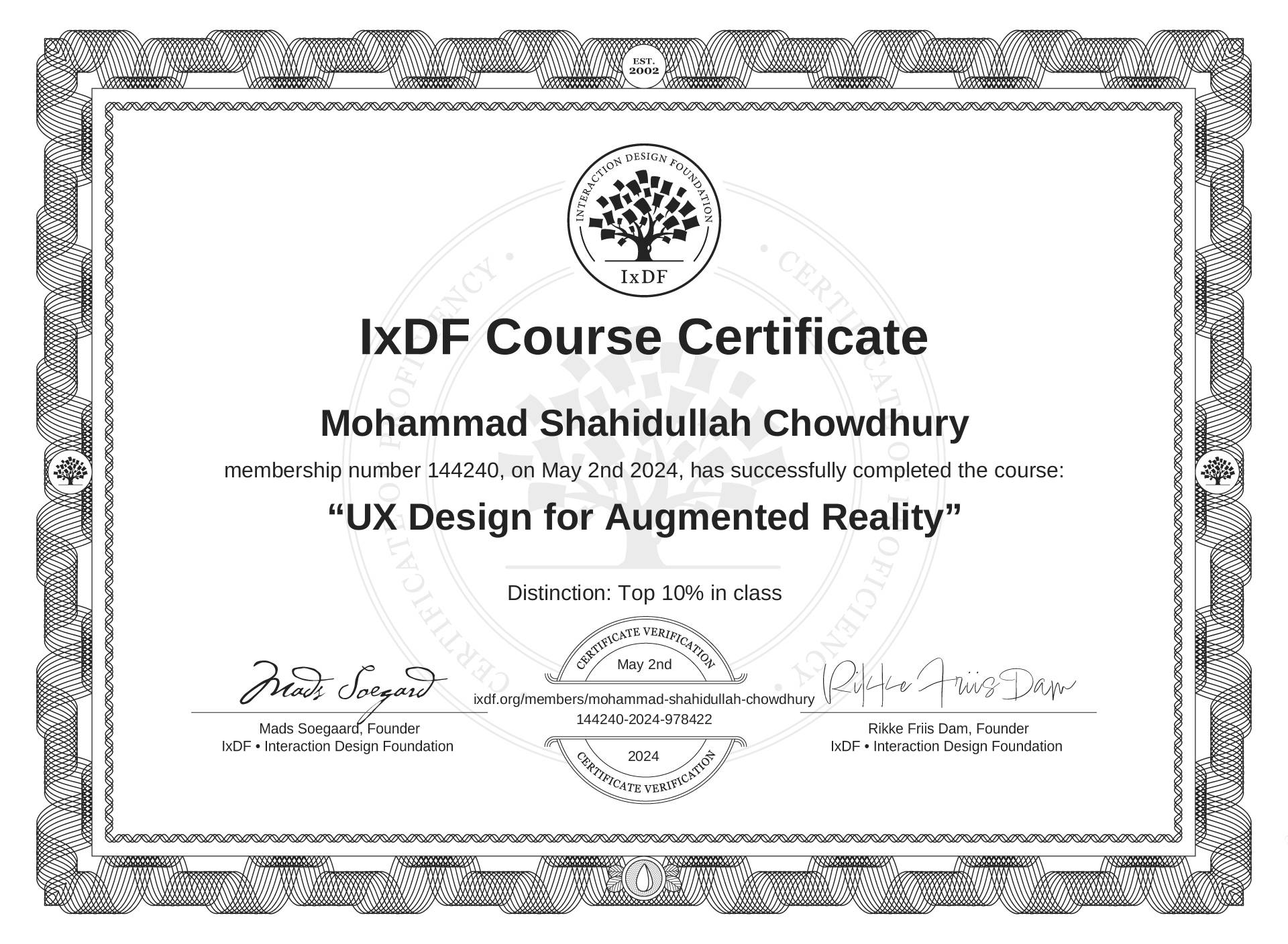 The IxDF Course Certificate above is awarded to Mohammad Shahidullah Chowdhury with a Top 10% Distinction in formal recognition of their coursework surpassing the rigorous benchmarks of exceptional performance established by the IxDF Educational Codex.