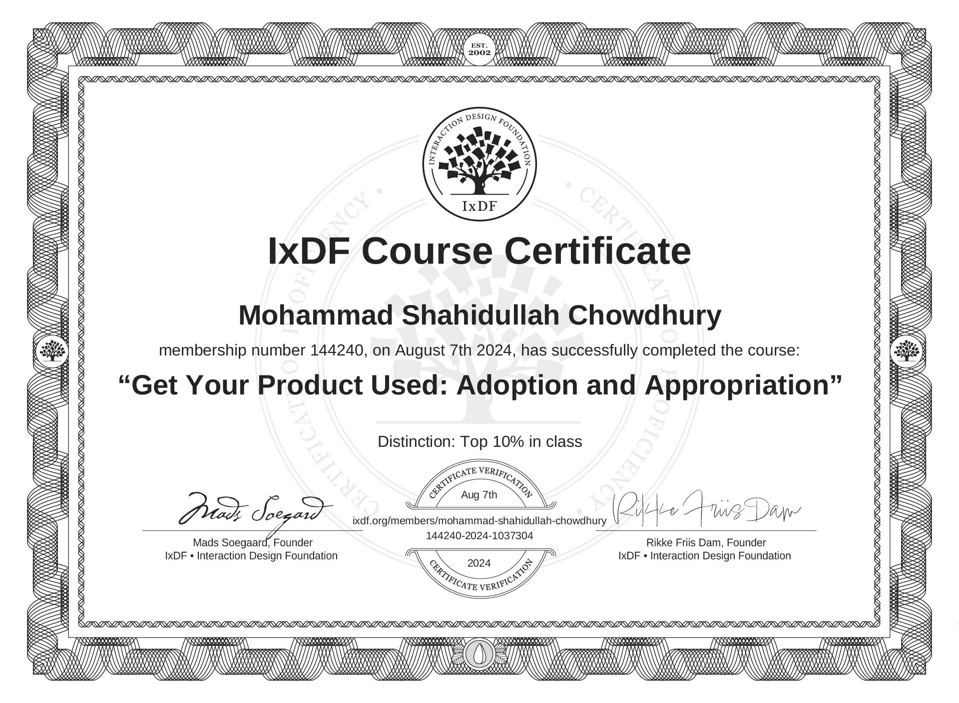 The IxDF Course Certificate above is awarded to Mohammad Shahidullah Chowdhury with a Top 10% Distinction in formal recognition of their coursework surpassing the rigorous benchmarks of exceptional performance established by the IxDF Educational Codex.