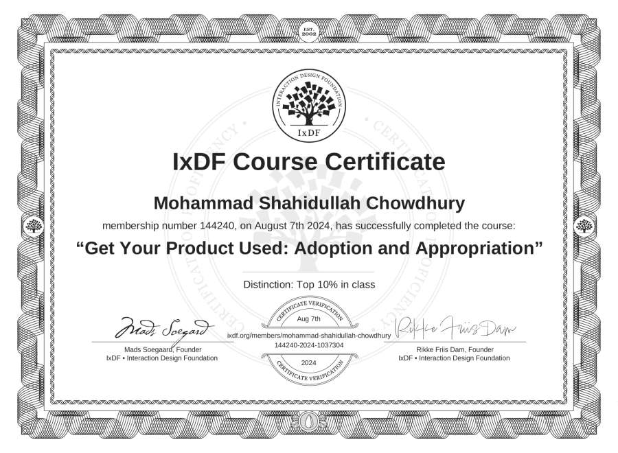 Mohammad Shahidullah Chowdhury's IxDF Course Certificate: Get Your Product Used: Adoption and Appropriation