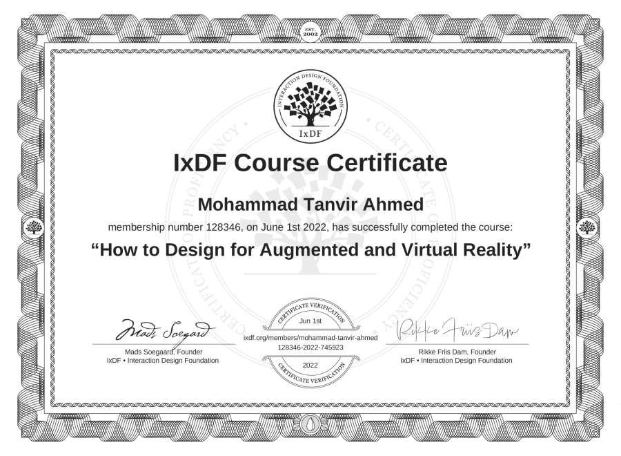 Mohammad Tanvir Ahmed's IxDF Course Certificate: How to Design for Augmented and Virtual Reality