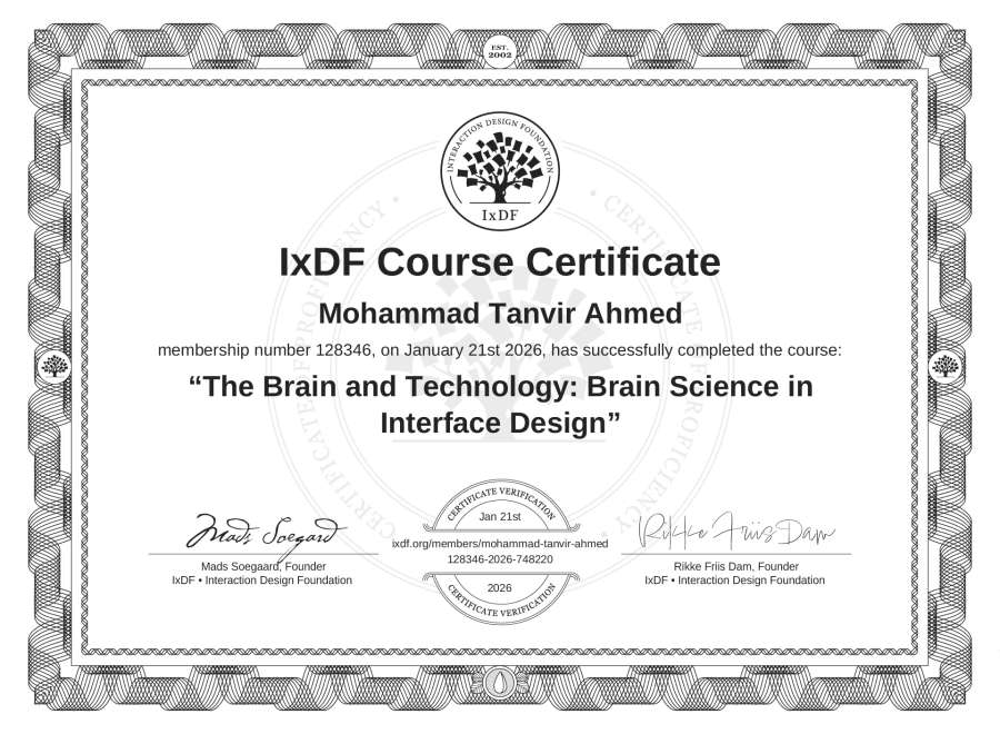 Mohammad Tanvir Ahmed's IxDF Course Certificate: The Brain and Technology: Brain Science in Interface Design