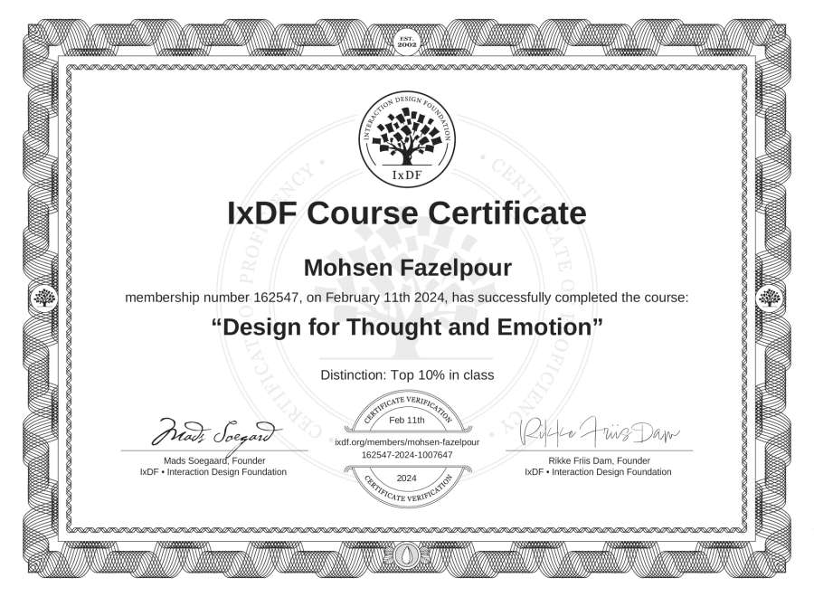 Mohsen Fazelpour's IxDF Course Certificate: Design for Thought and Emotion