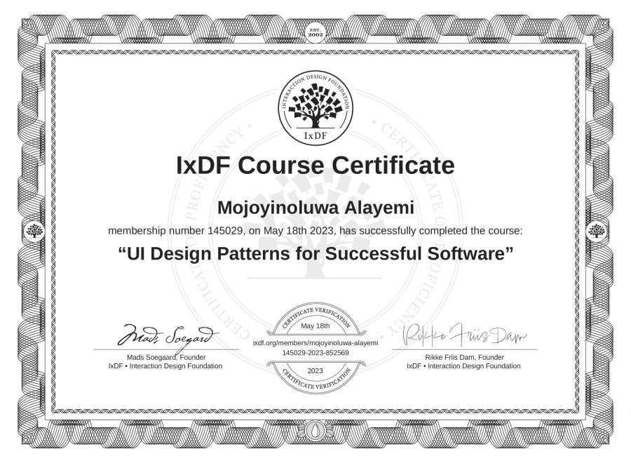 Mojoyinoluwa Alayemi's IxDF Course Certificate: UI Design Patterns for Successful Software