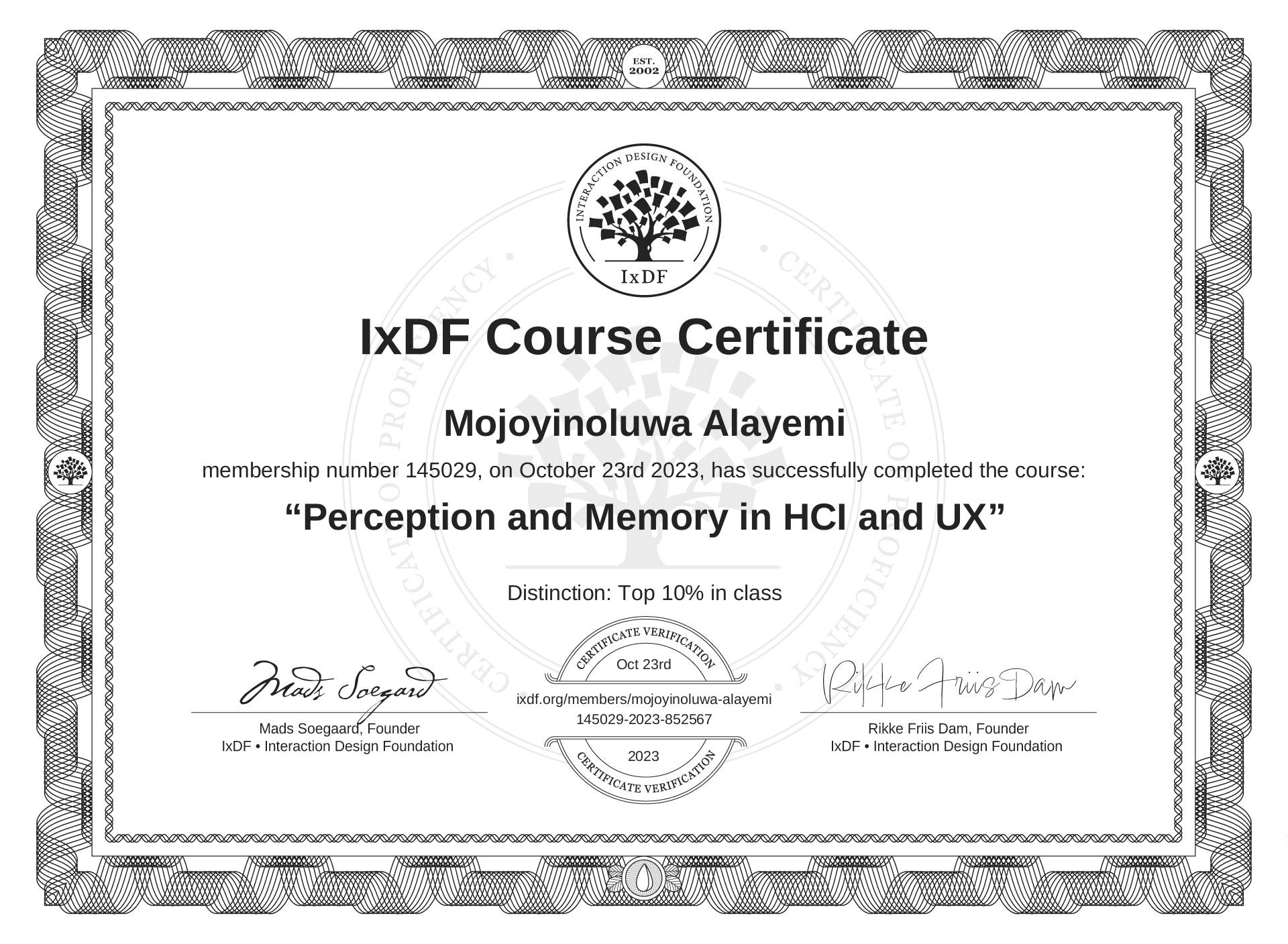 Mojoyinoluwa Alayemi's IxDF Course Certificate: Perception and Memory in HCI and UX