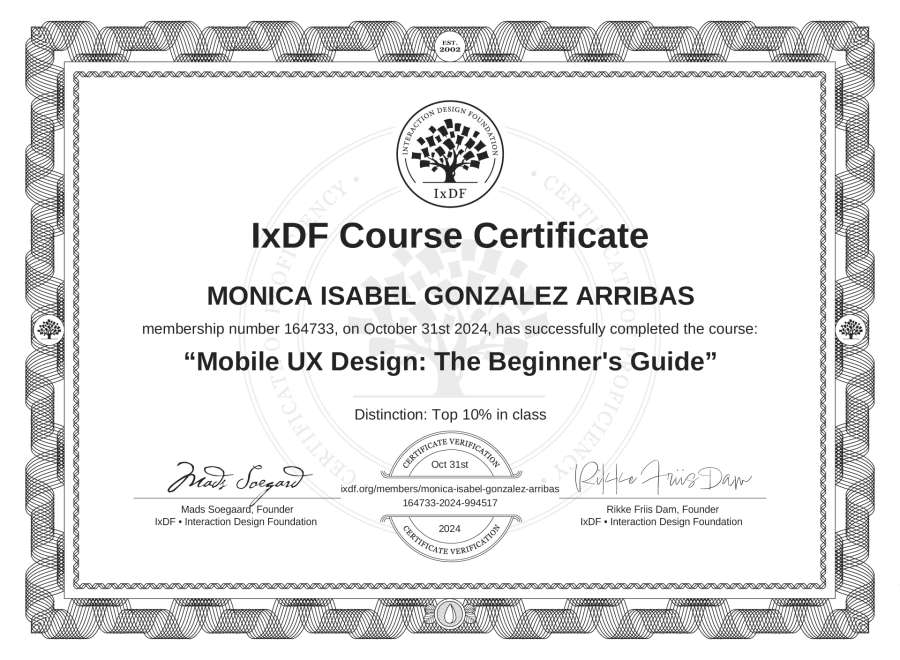 The IxDF Course Certificate above is awarded to MONICA ISABEL GONZALEZ ARRIBAS with a Top 10% Distinction in formal recognition of their coursework surpassing the rigorous benchmarks of exceptional performance established by the IxDF Educational Codex.