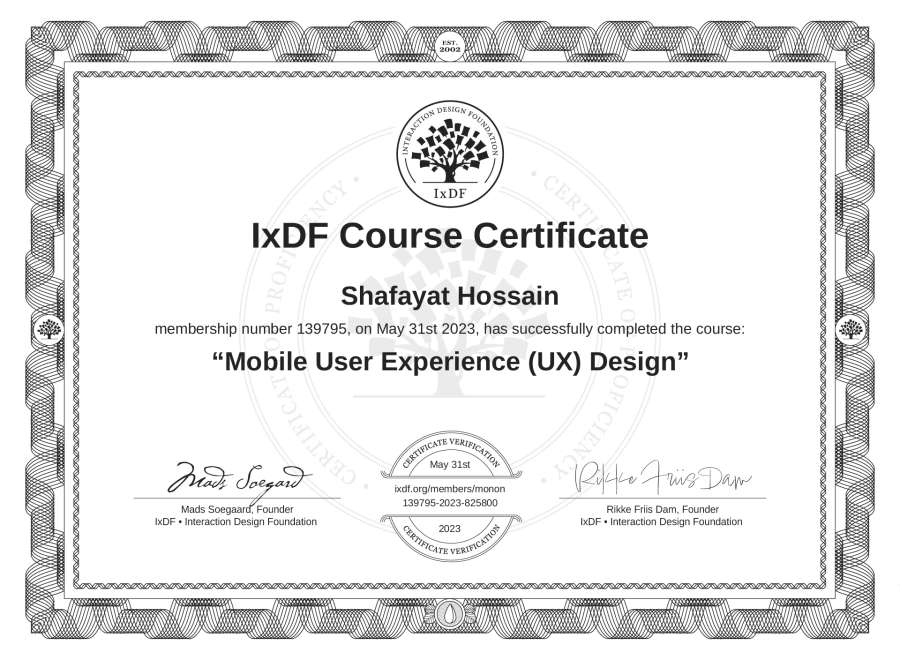 Shafayat Hossain's IxDF Course Certificate: Mobile User Experience (UX) Design