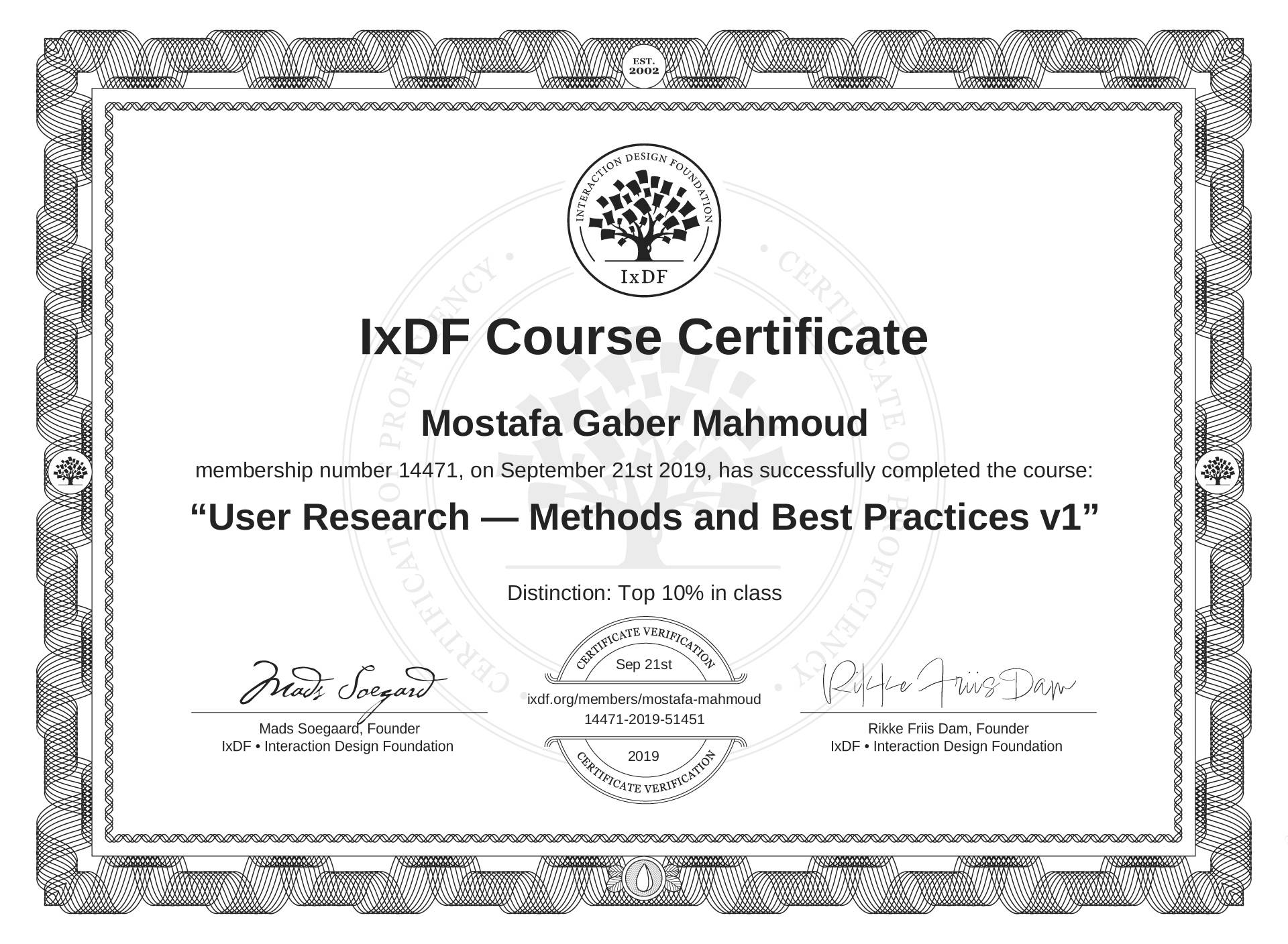 Mostafa Gaber Mahmoud's IxDF Course Certificate: User Research — Methods and Best Practices v1