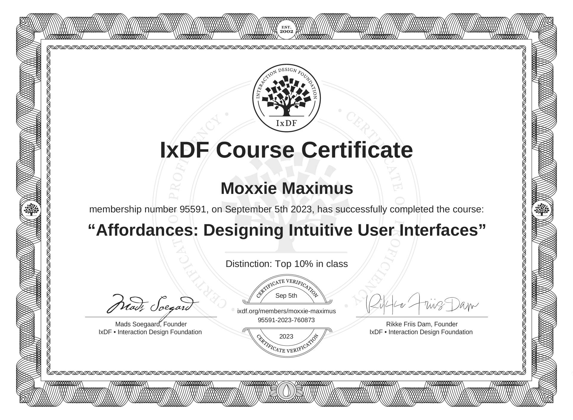 The IxDF Course Certificate above is awarded to Moxxie Maximus with a Top 10% Distinction in formal recognition of their coursework surpassing the rigorous benchmarks of exceptional performance established by the IxDF Educational Codex.