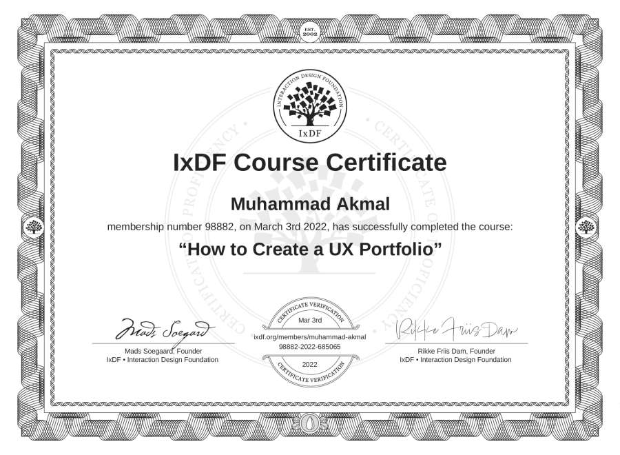 Muhammad Akmal's IxDF Course Certificate: How to Create a UX Portfolio