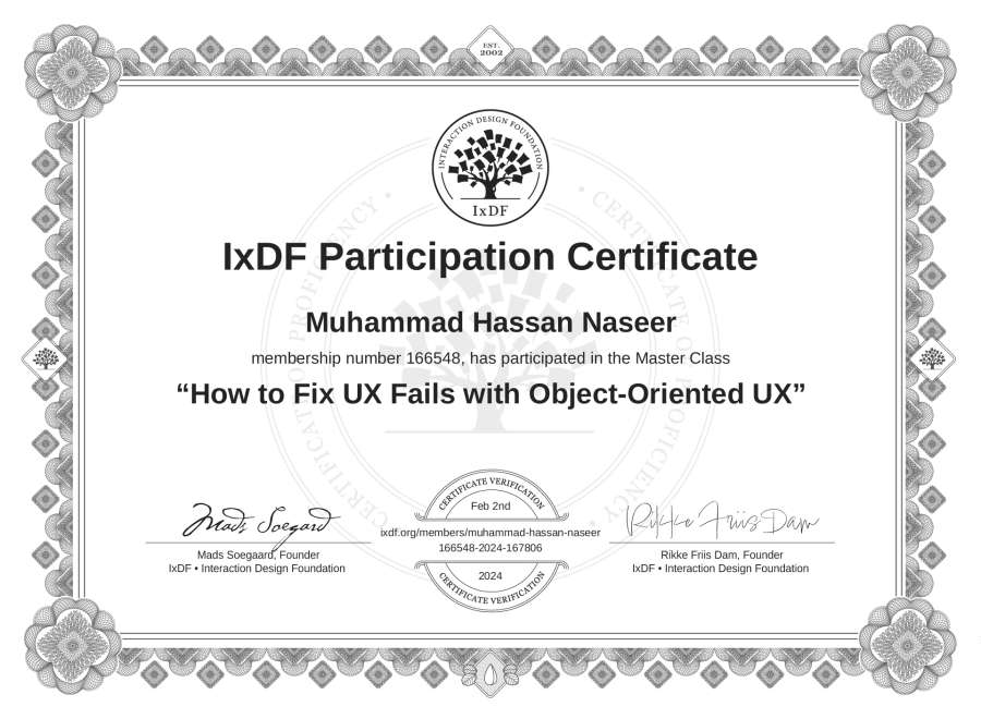 Muhammad Hassan Naseer's IxDF Masterclass Certificate: How to Fix UX Fails with Object-Oriented UX